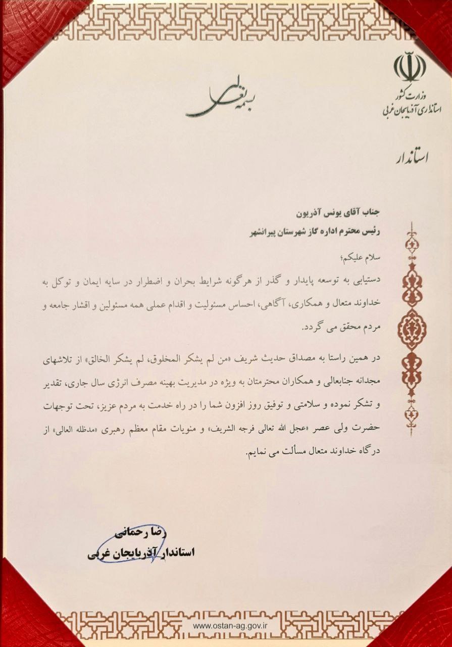 استاندار آذربایجان غربی از رئیس و مجموعه همکاران اداره گاز پیرانشهر به جهت تلاش مجدانه در تامین پایدار گاز و مدیریت بهینه مصرف انرژی در سال ۱۴۰۳ تقدیر کرد