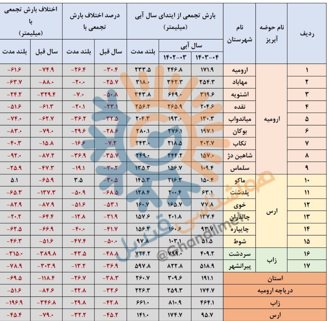 مجموع بارندگی سال زراعی پیرانشهر از ۵۰۰ میلیمتر گذشت اما همچنان نسب به مدت مشابه سال قبل و درازمدت کاهش نشان می دهد. عبدالرحمن ابراهیمی رییس اداره هواشناسی پیرانشهر به خبرنگار پیرانشهر رووداو گفت: مجموع بارندگی سال زراعی جاری در ایستگاه_هواشناسی_پیرانشهر به ۵۱۸/۹ میلیمتر رسیده که نسبت به مدت مشابه سال گذشته ۳۷ درصد و نسبت به میانگین درازمدت ۱۳ درصد کاهش نشان میدهد. جدول وضعیت بارش سال زراعی جاری و مقایسه آن با مدت مشابه سال گذشته و بلندمدت ایستگاه های هواشناسی استان آذربایجانغربی تا تاریخ ۱۴۰۴/۰۱/۲۵
