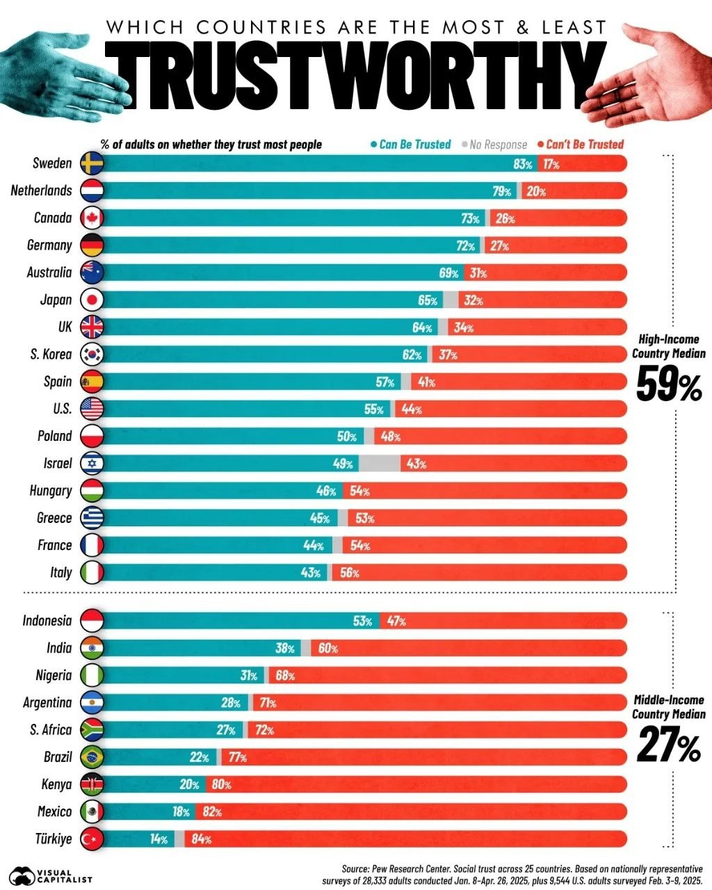 مرکز تحقیقات پیو در سال ۲۰۲۵ نظرسنجیهای گستردهای در سطح ۲۵ کشور در مورد سطح اعتماد اجتماعی انجام داد.